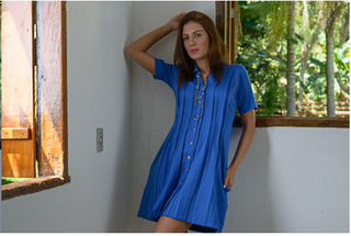 Essa modelagem é ótima. Trata-se de um chemisier, muito charmoso, com modelagem reta, decote em “v” e pregas que formam linhas verticais ajudando a alongar a silhueta, além da manga. na versão monocromática confeccionada em piquet num Azul Turquesa concordando com as cores das passarelas que é aposta das ruas.